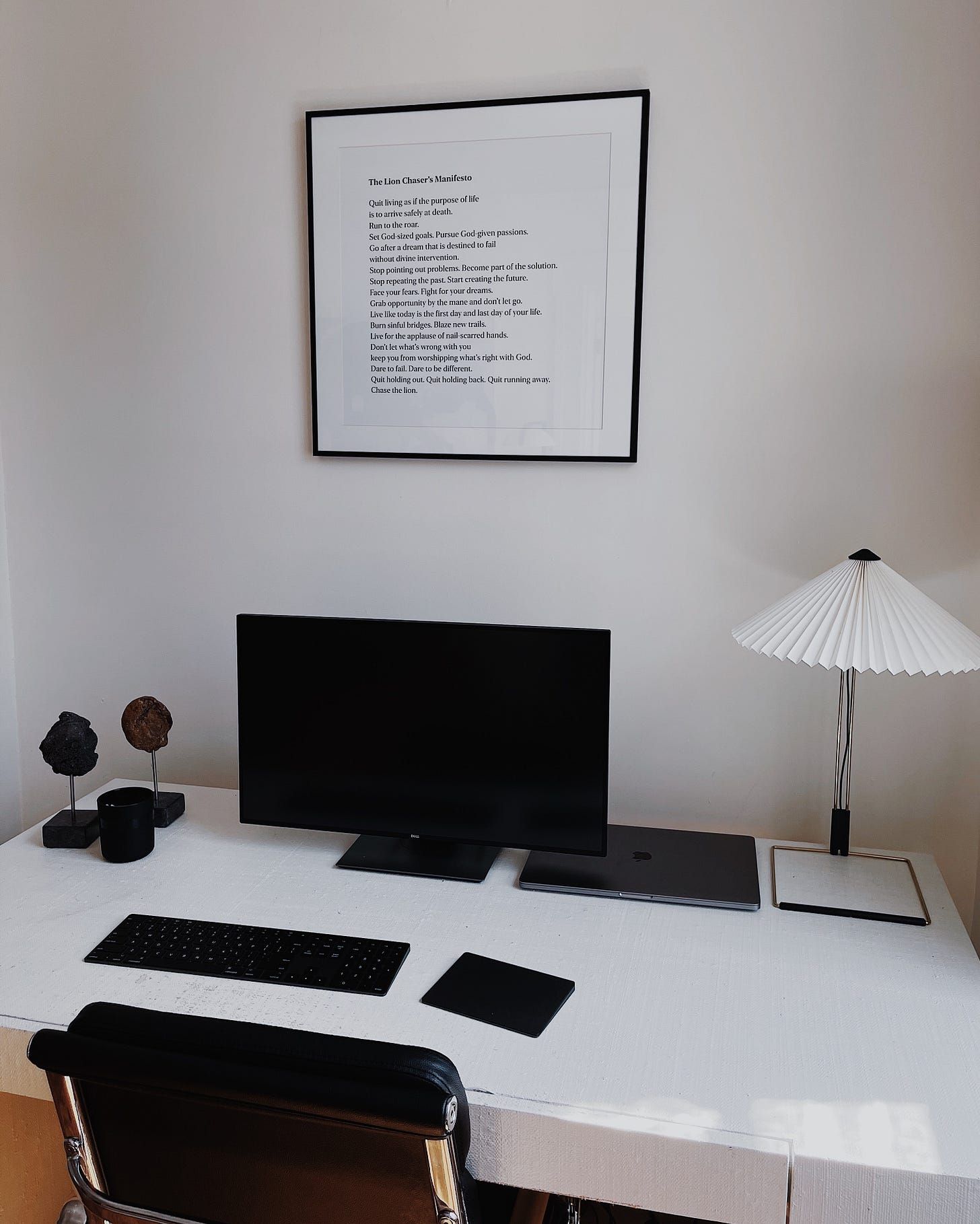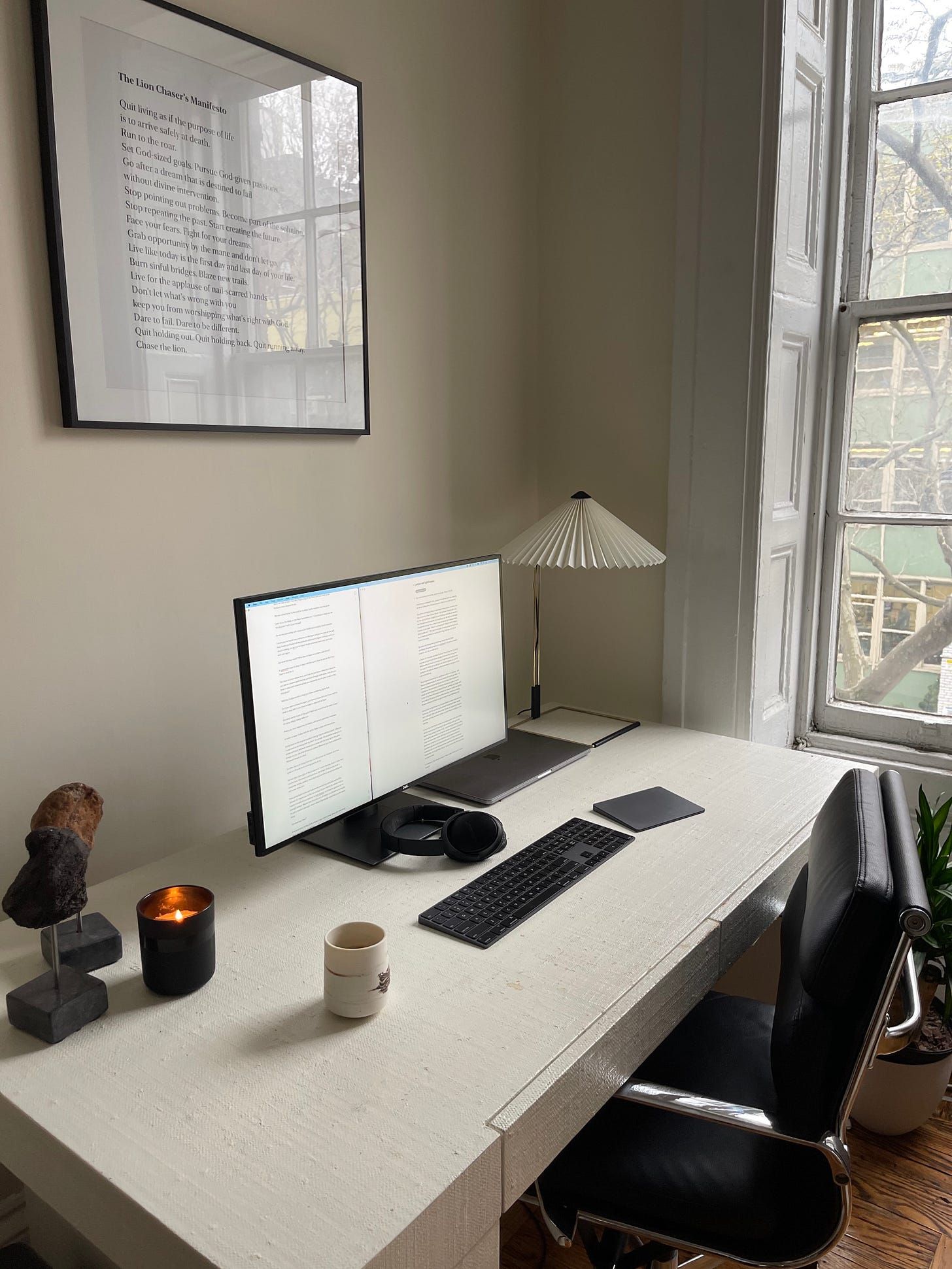 Brandon tries to keep his technical usage to a minimum for my workspace. He has learned that he performs best with a setup that maximizes focus over “productivity” — Optimizing for the latter often has quite the opposite effect for him.
