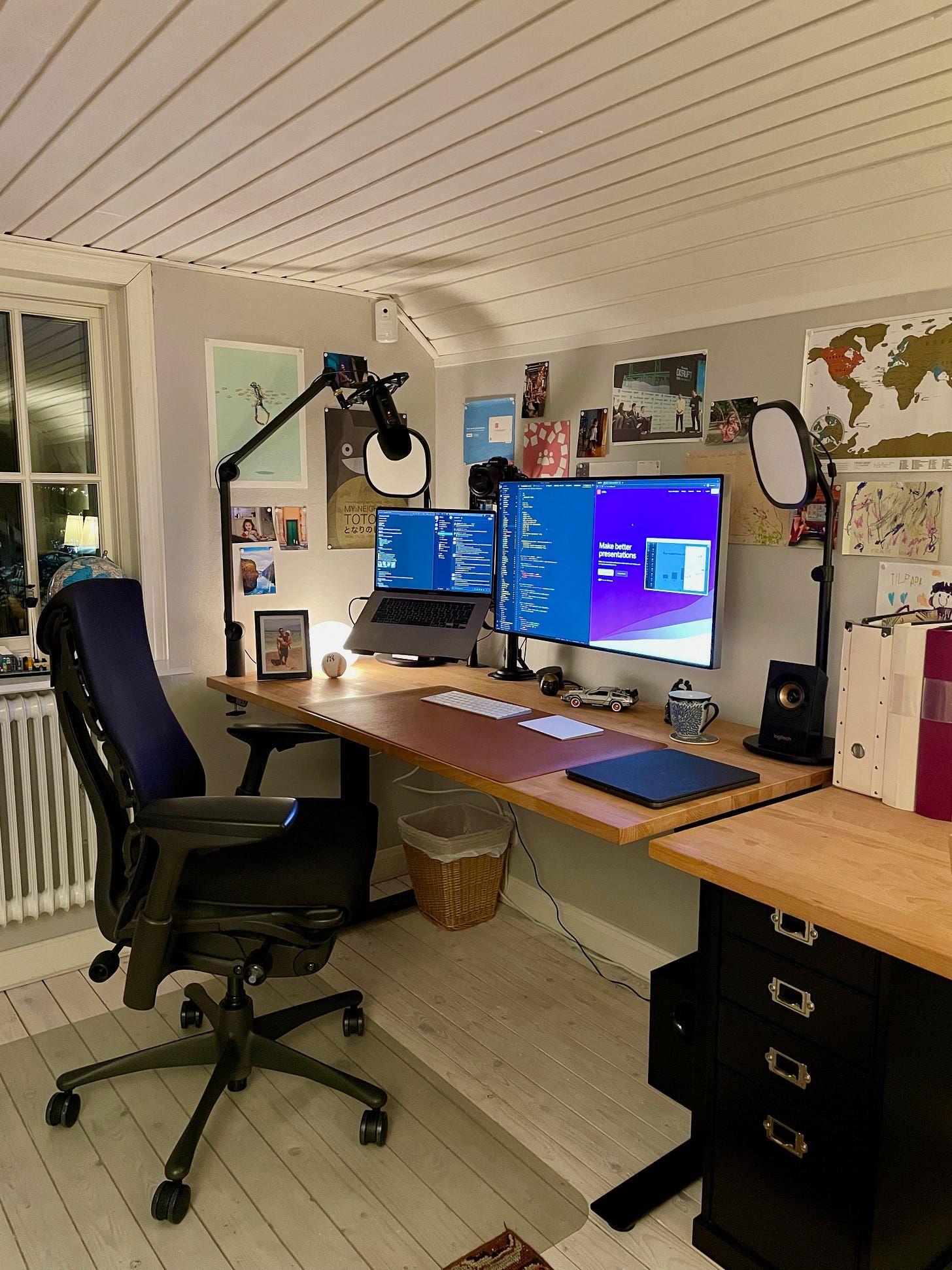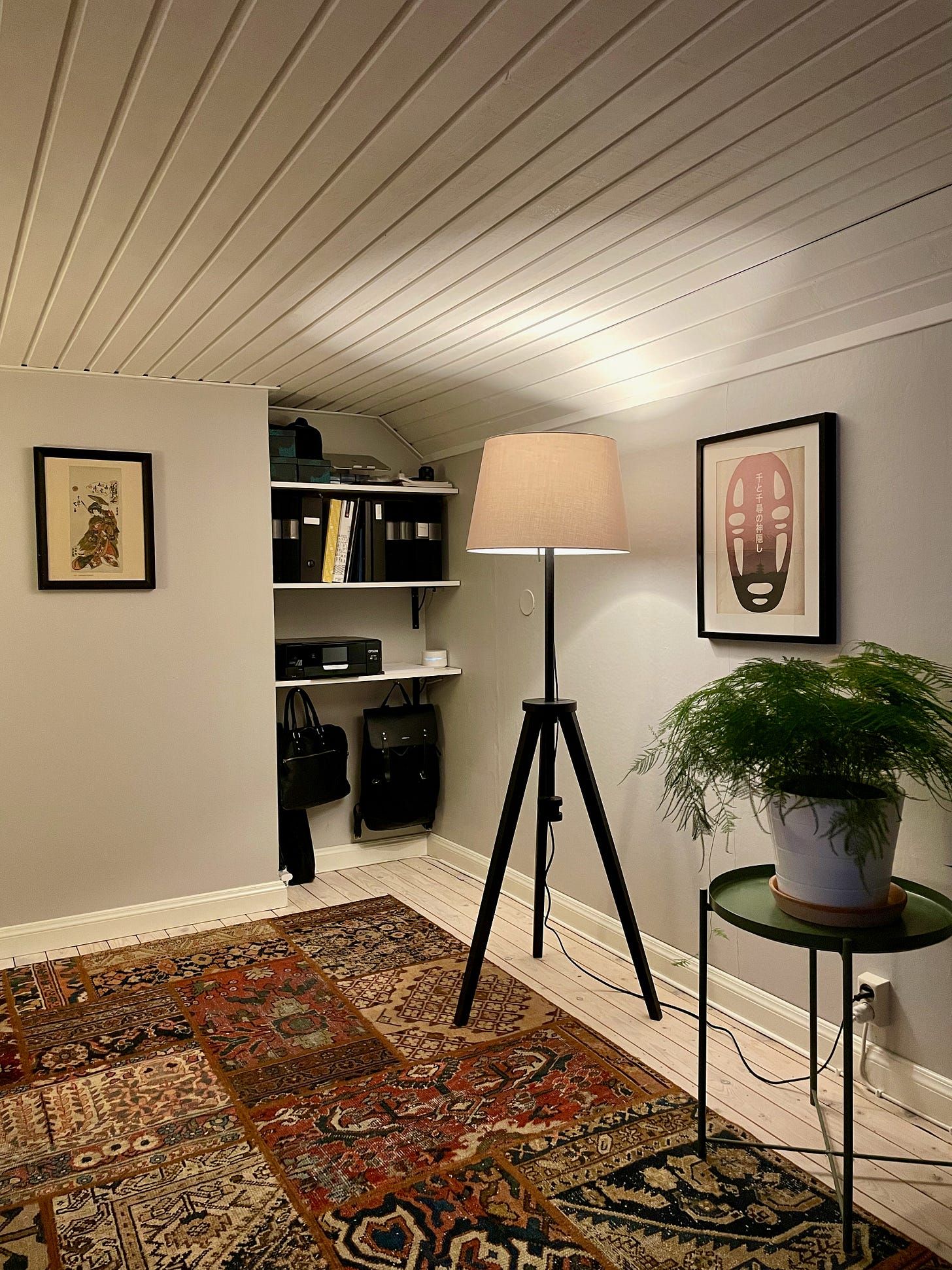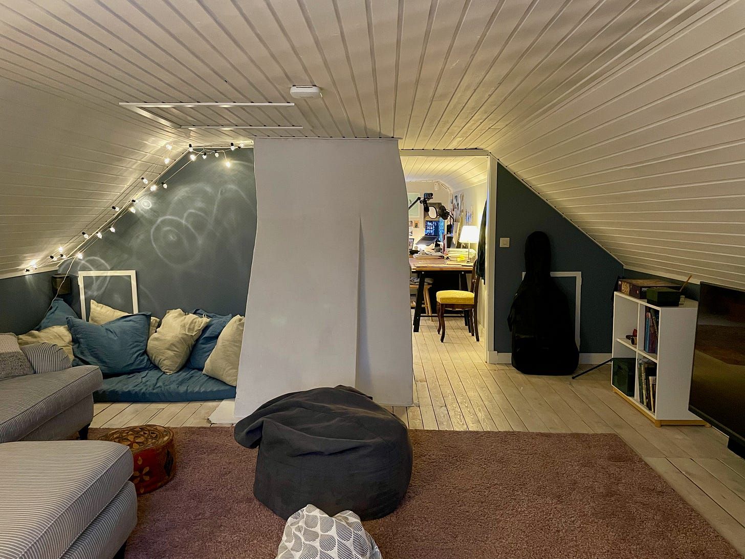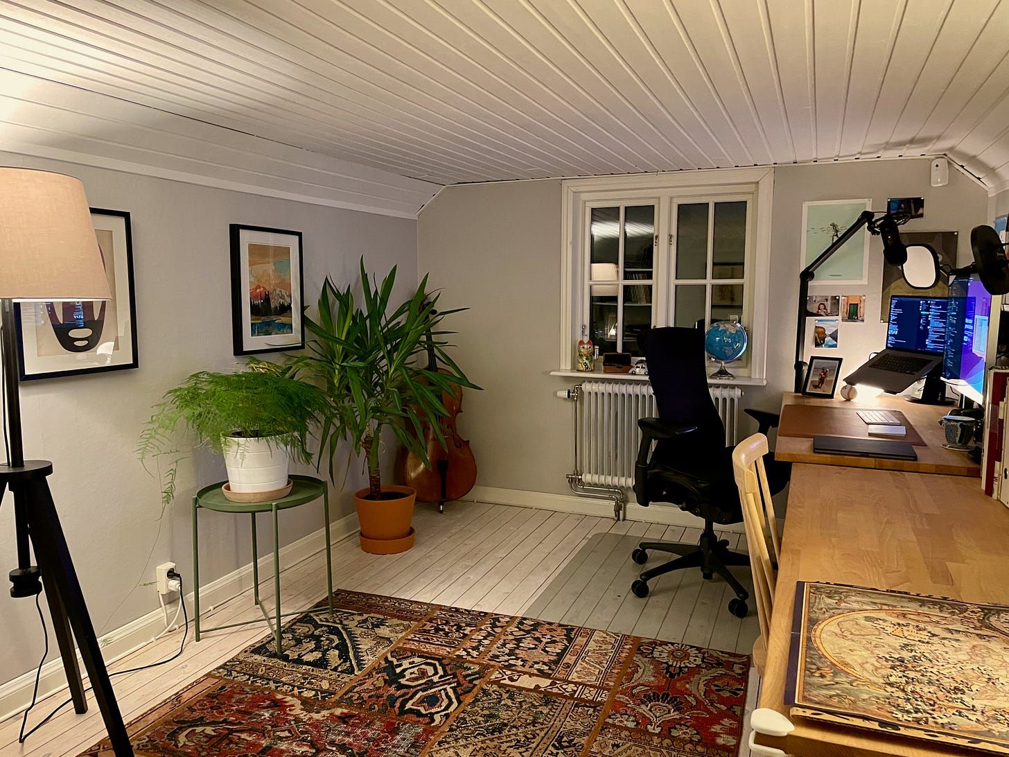 His office is in his attic which he’s converted from storage space into a double home office and a TV/video game room. The limited space and low slanted ceiling easily makes it the coziest space in his house.
