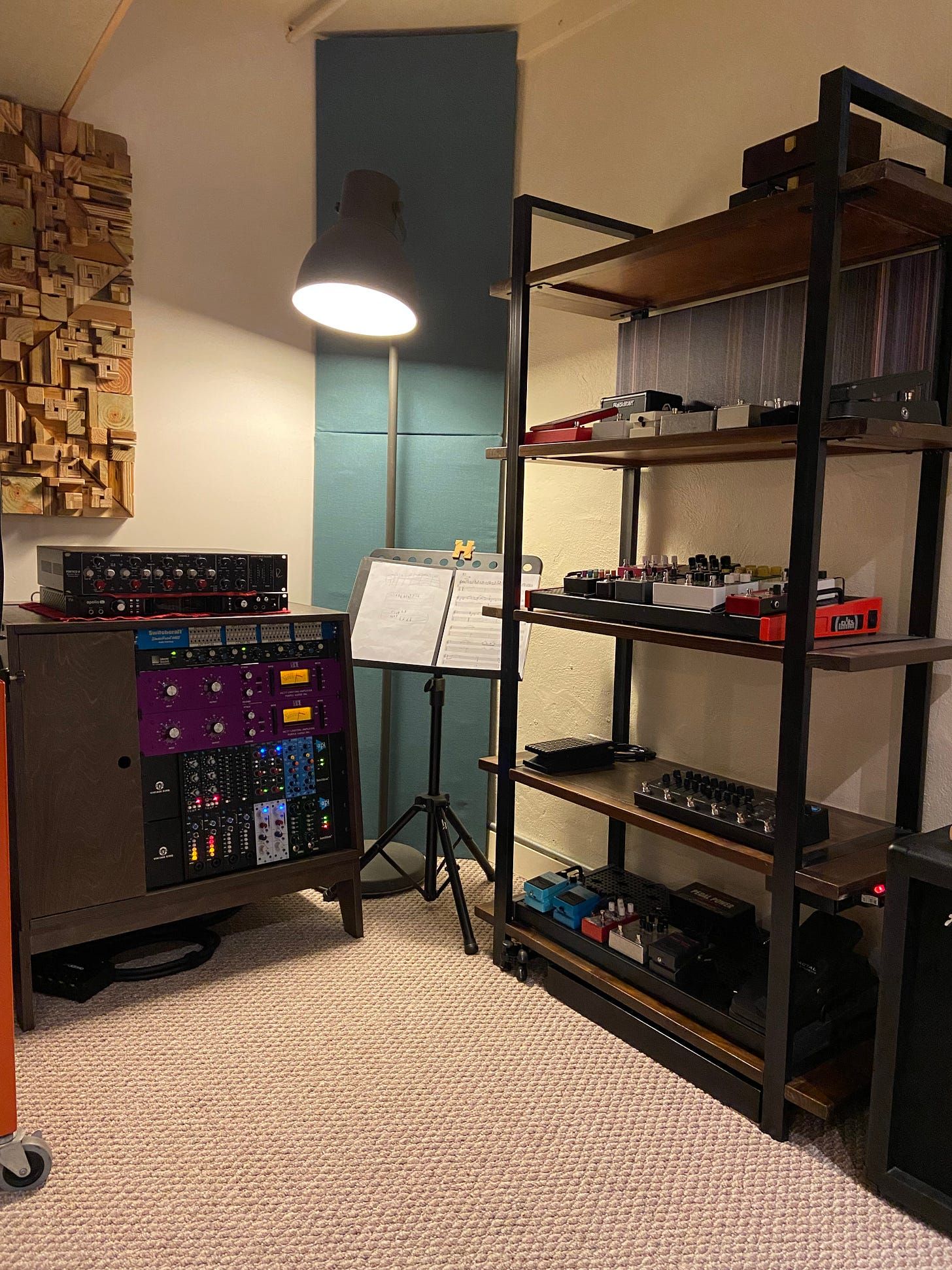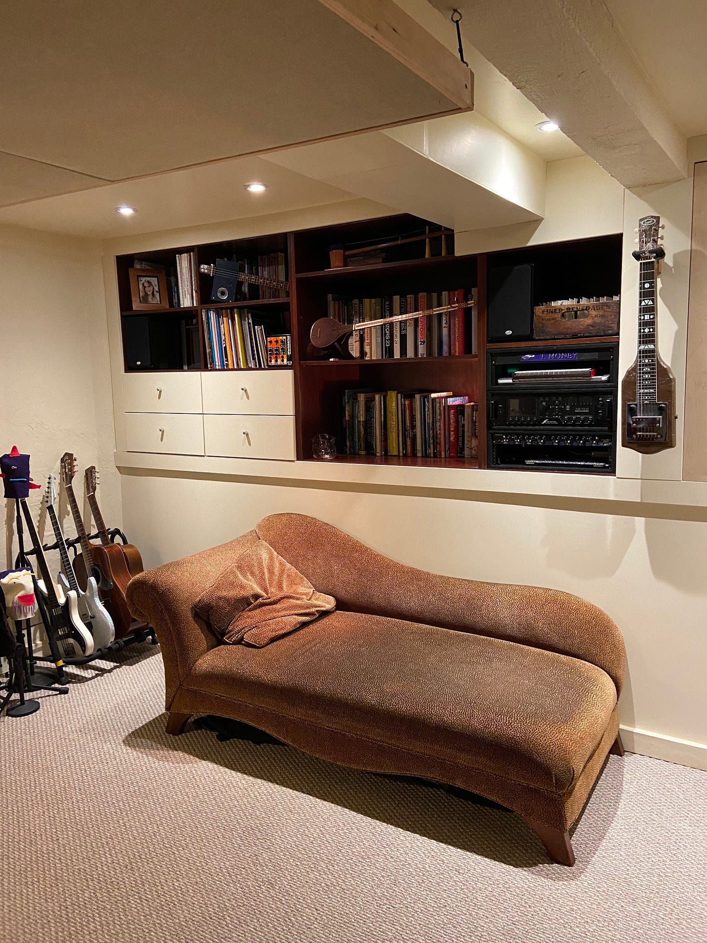 Useful tools include shelves of books that go several rows back that double as sound treatment. A disgusting leopard chaise that I've had for 13 years for pontificating and listening back to music. A lot of guitar stuff: instruments, pedals, a homemade amp from a friend. Also, a cabinet filled with 8 channels of analog recording equipment.