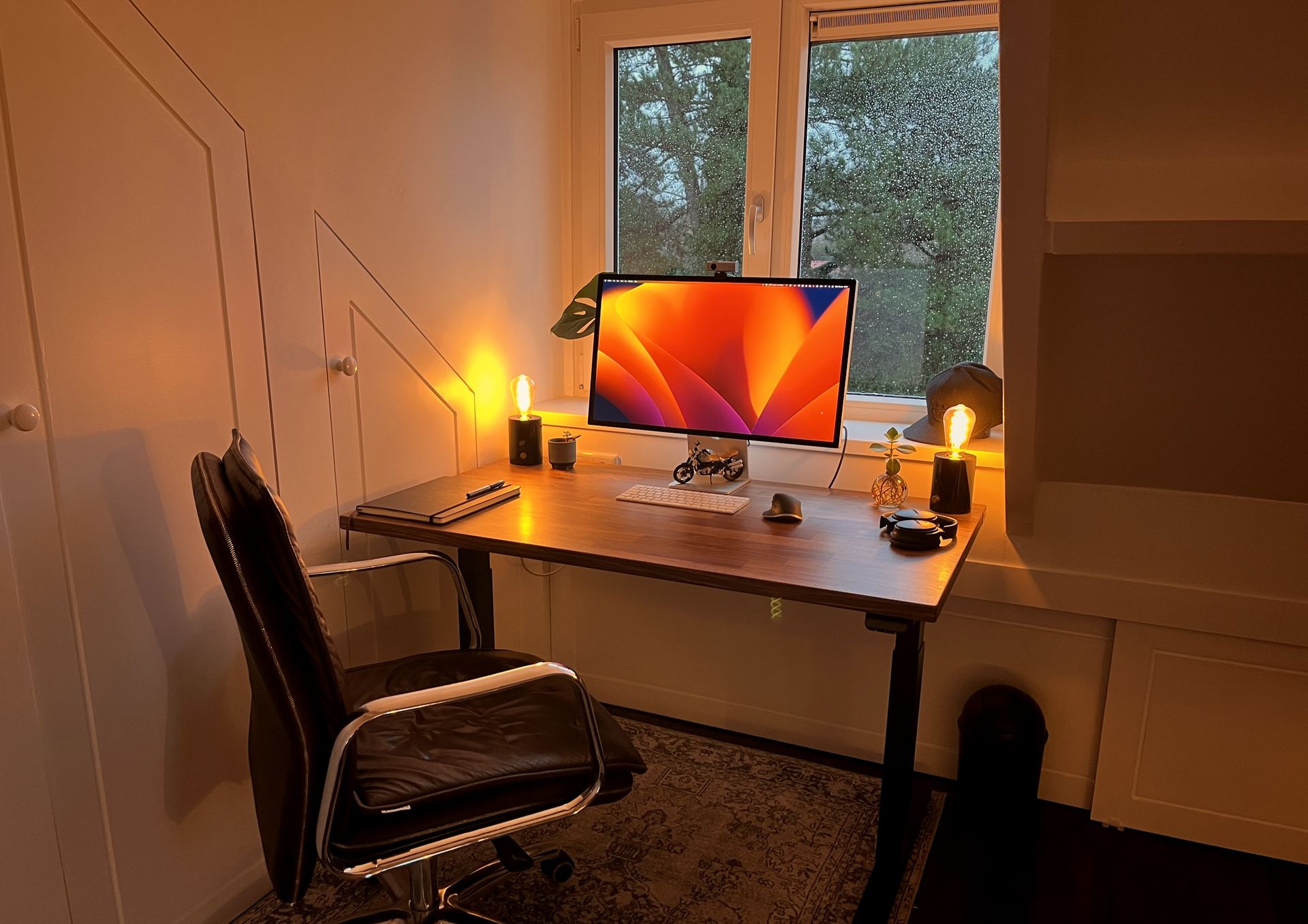 Three things are my favorite; 1. my new walnut wood standing desk from Standidesk that fits exactly between the dormer/window space, 2. my Ikea Strandmon armchair with sheep skin and my miniture BMW RnineT motorcyle.