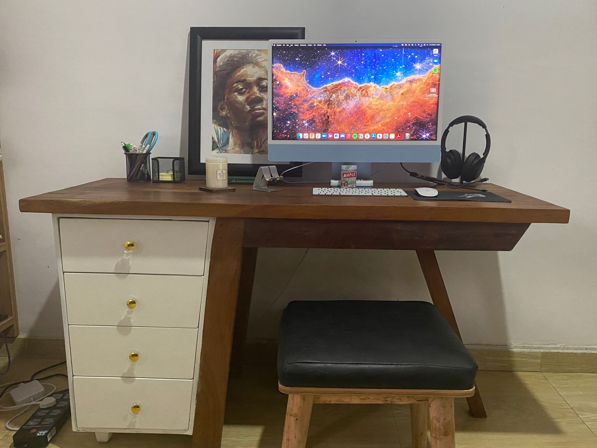 The artwork behind my iMac because it adds a bit of color to an otherwise blank white wall and it's pretty to look at. It's by a Nigerian artist called Chigozie Obi.