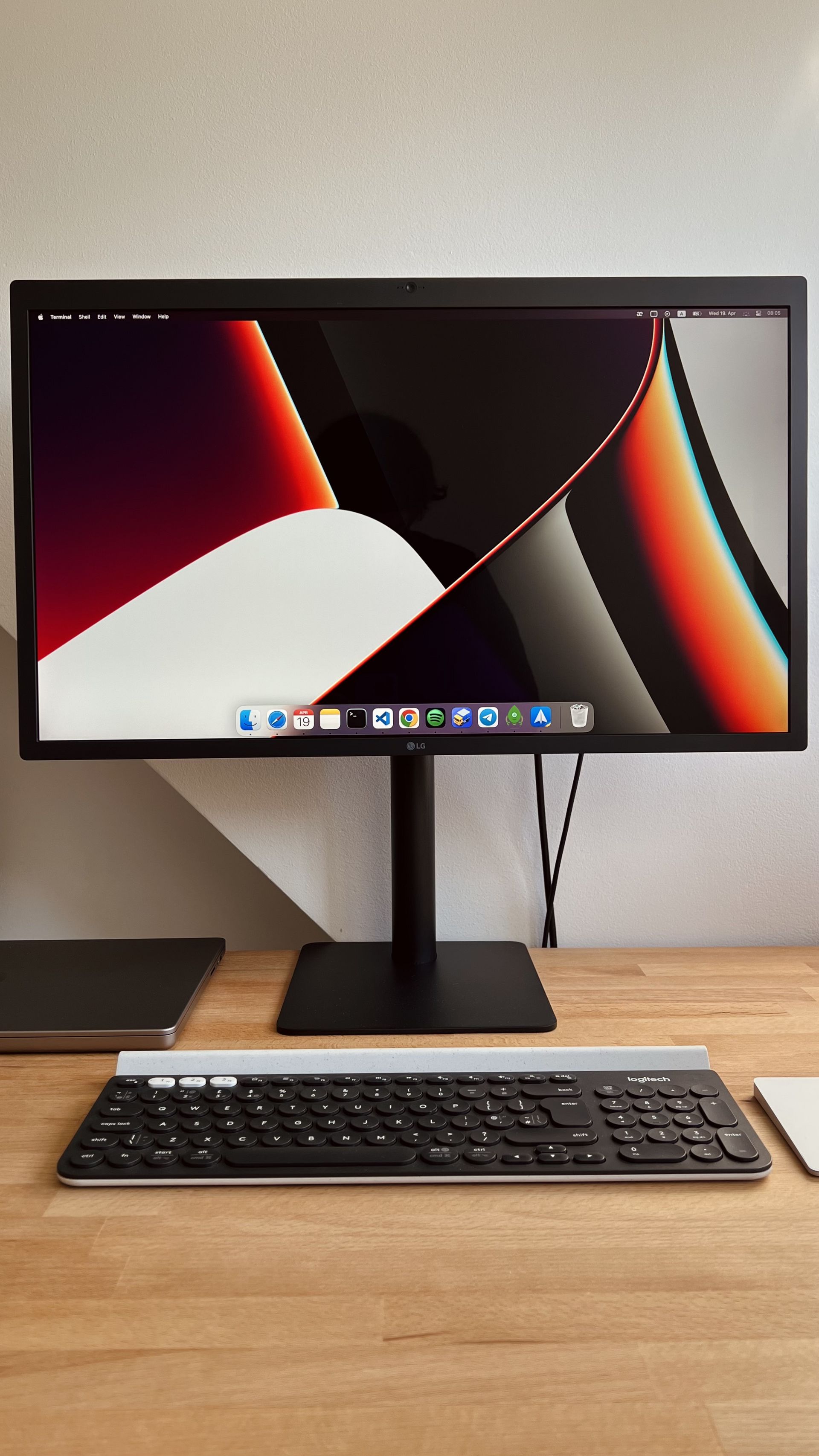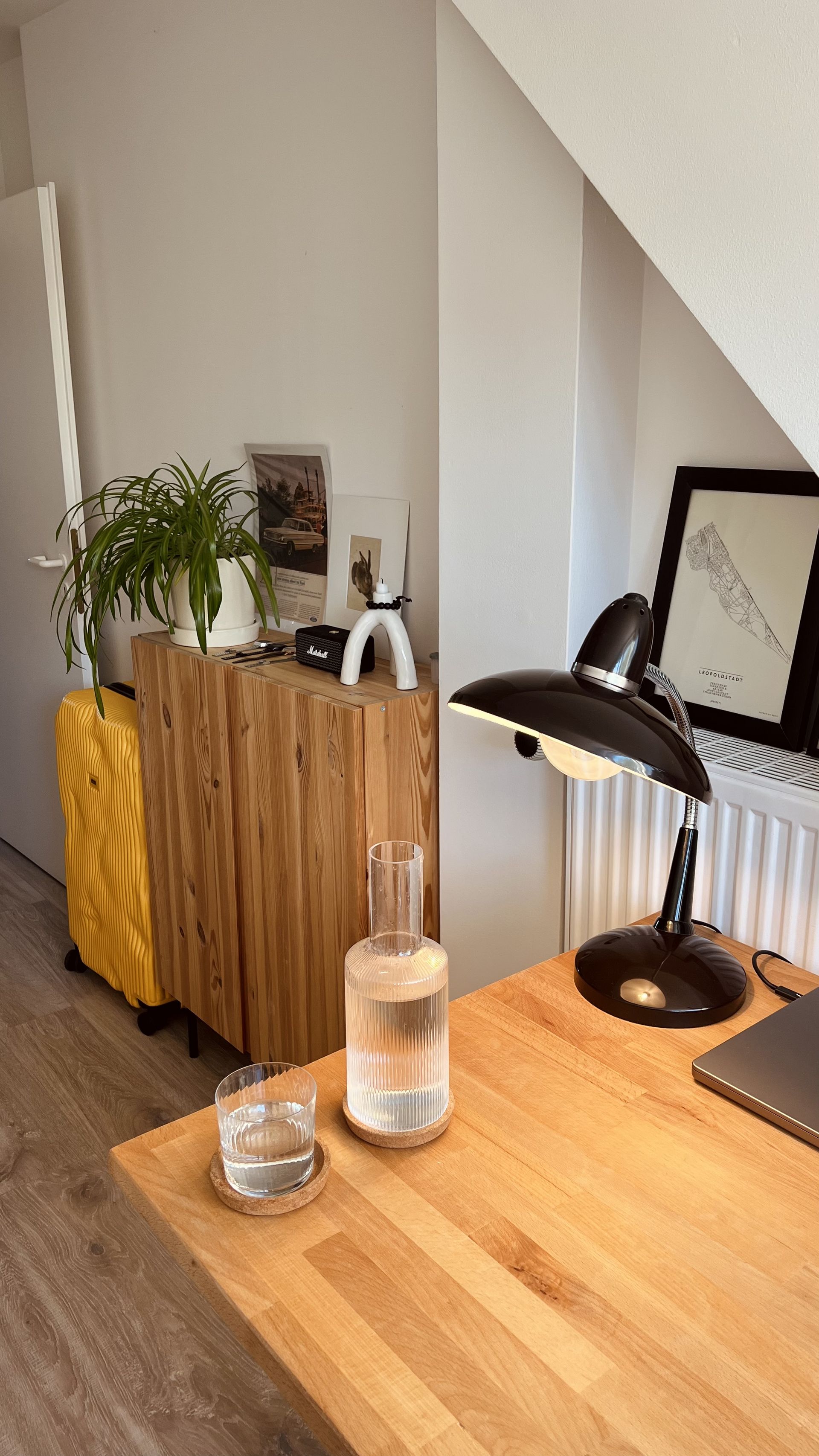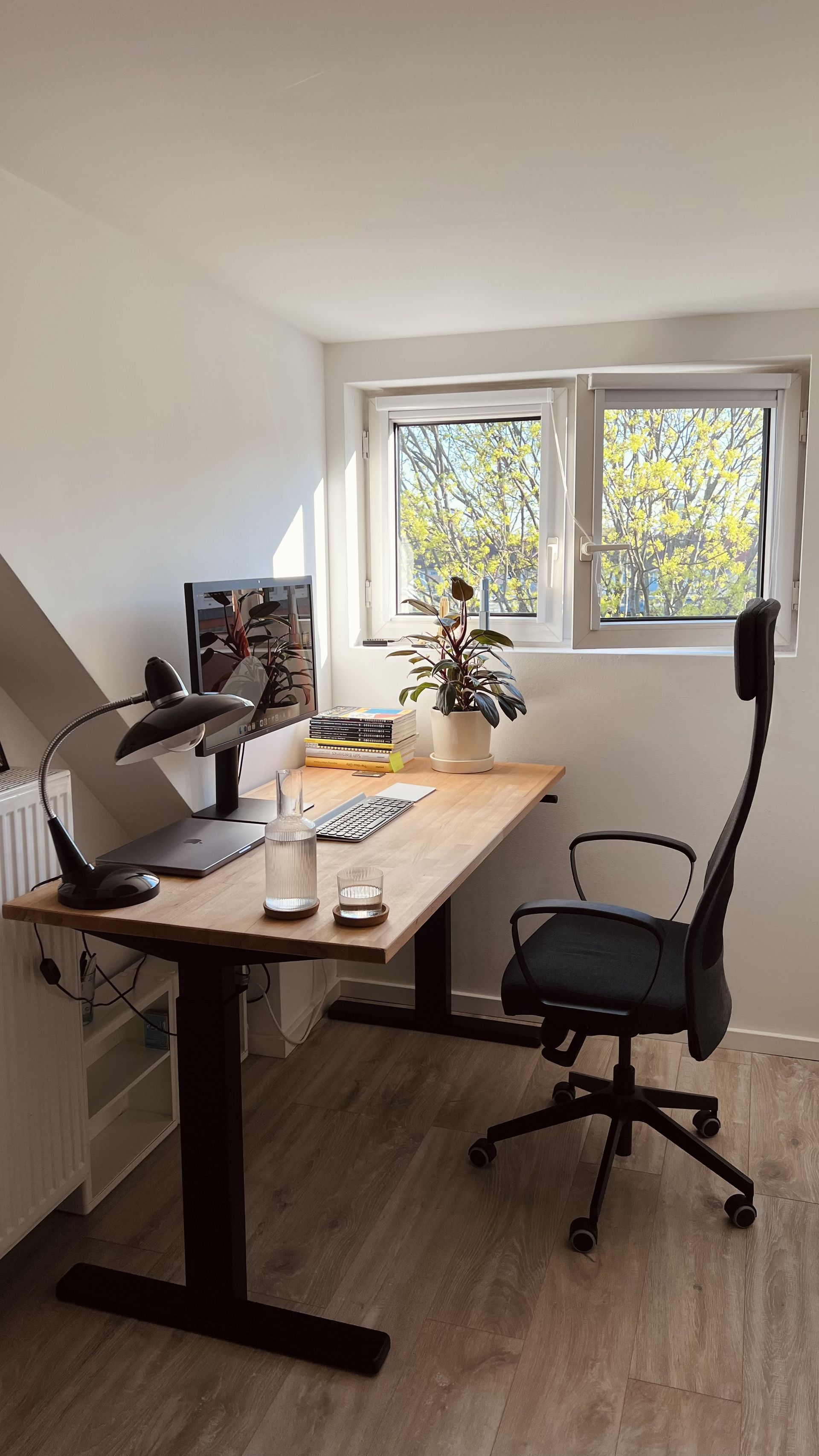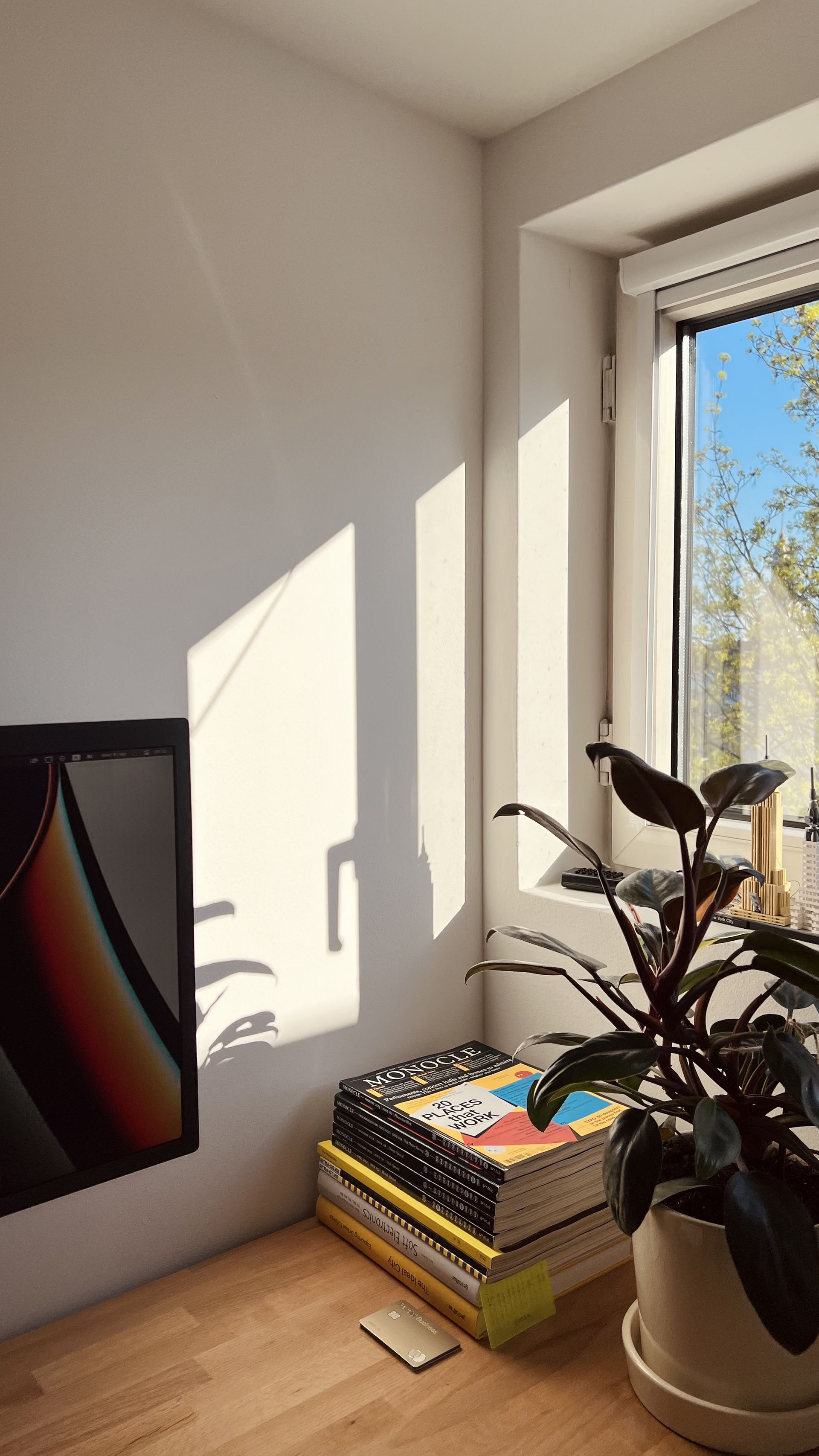 From an aesthetical point of view, the lamp that a friend smuggled in carry-on for me from a flea market in Puglia, Italy. From a practical point of view, my monitor. So many app windows fit onto it!