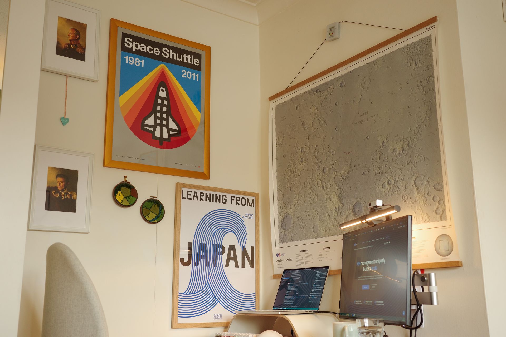 With that said, every inch of wallspace is covered with art and design to inspire him during long working days.