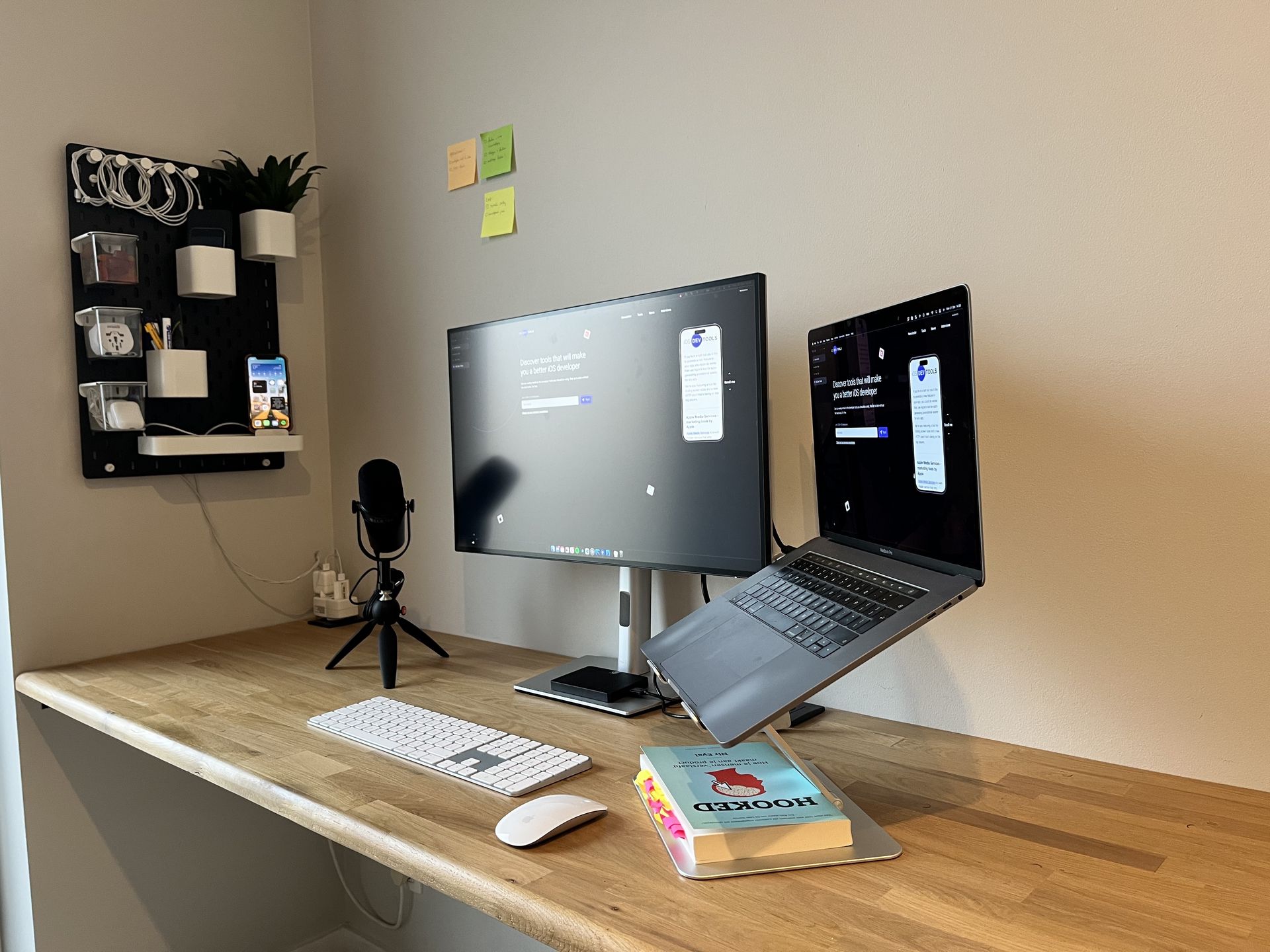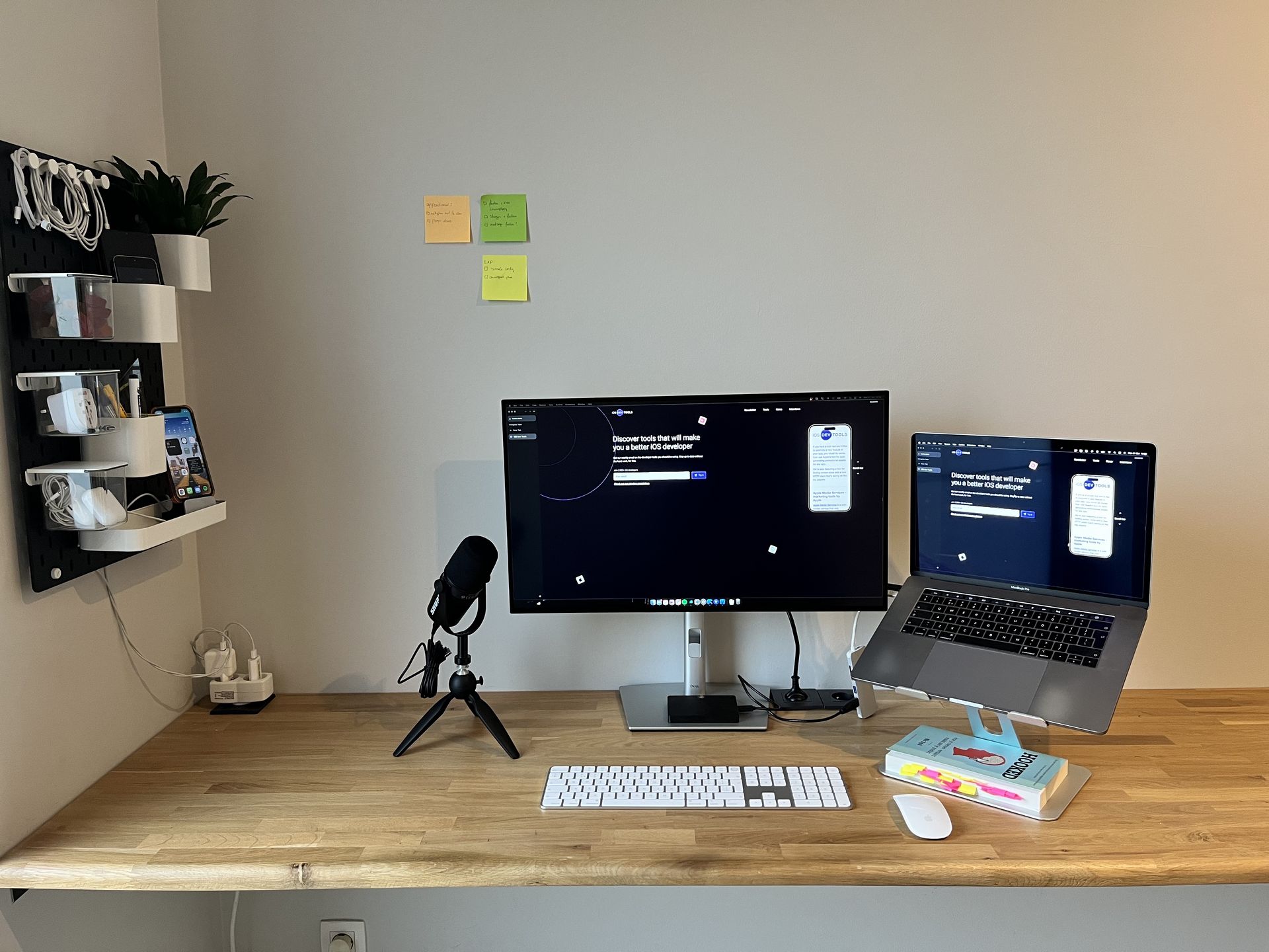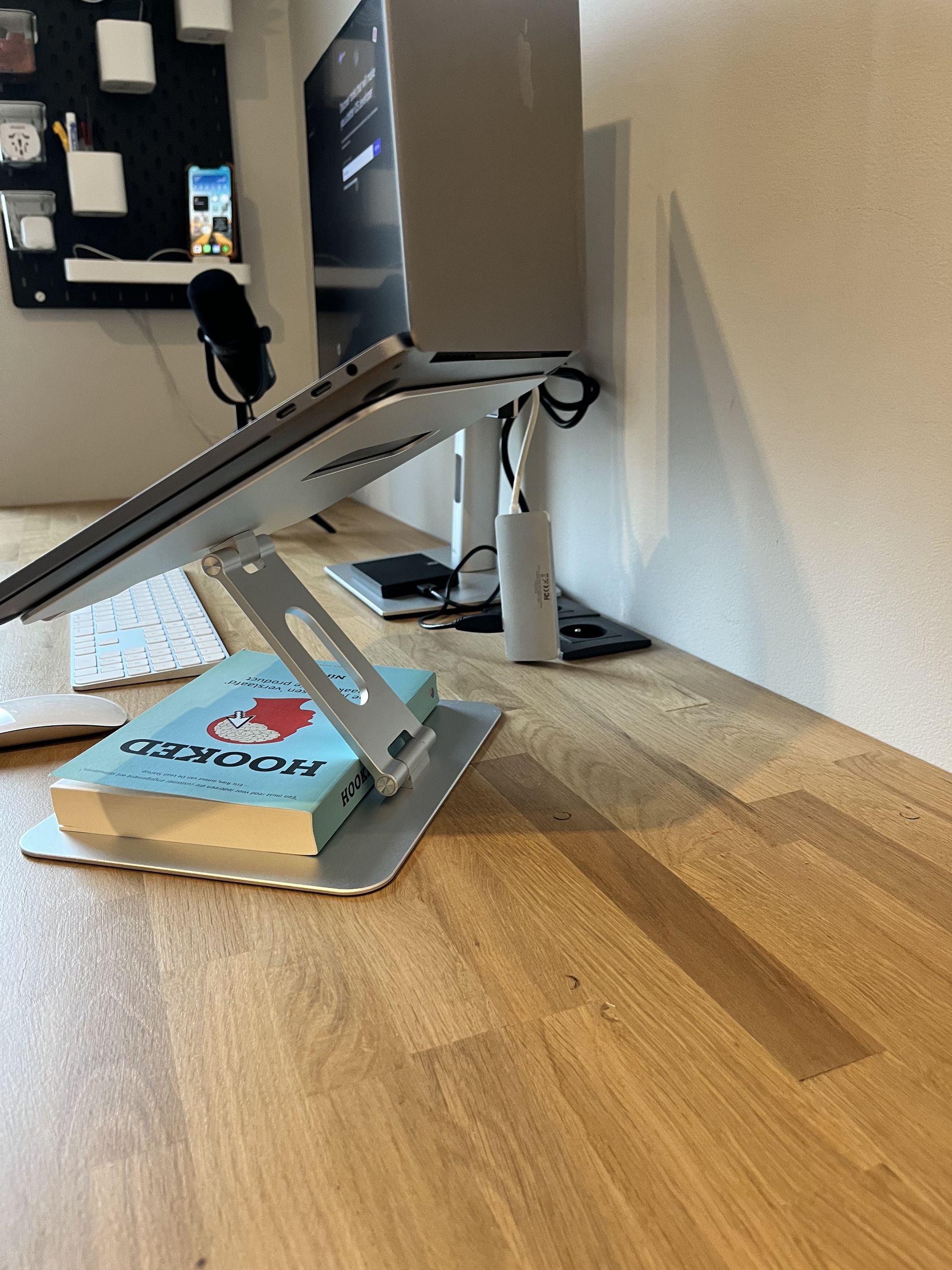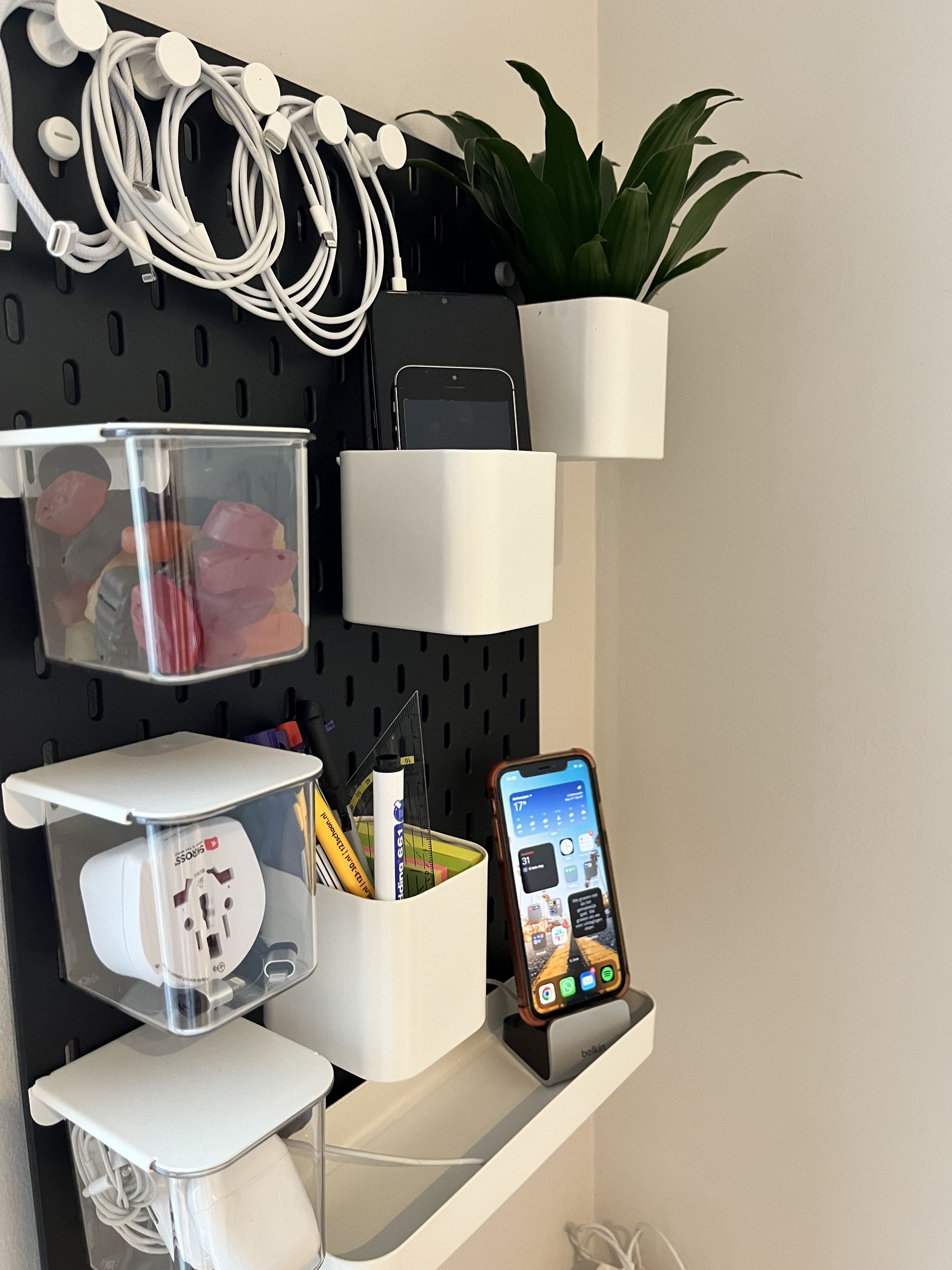 My new shelving. It is the SKÅDIS collection from Ikea and easily the best 50€ I have spent on my home office. I always had the problem of all the stuff laying on my desk, unorganised. Tons of cables, devices on top of each other, pens, post-its, …. Now everything is neatly organised and still easy to reach for. The desk went from total mayhem to completely zen.