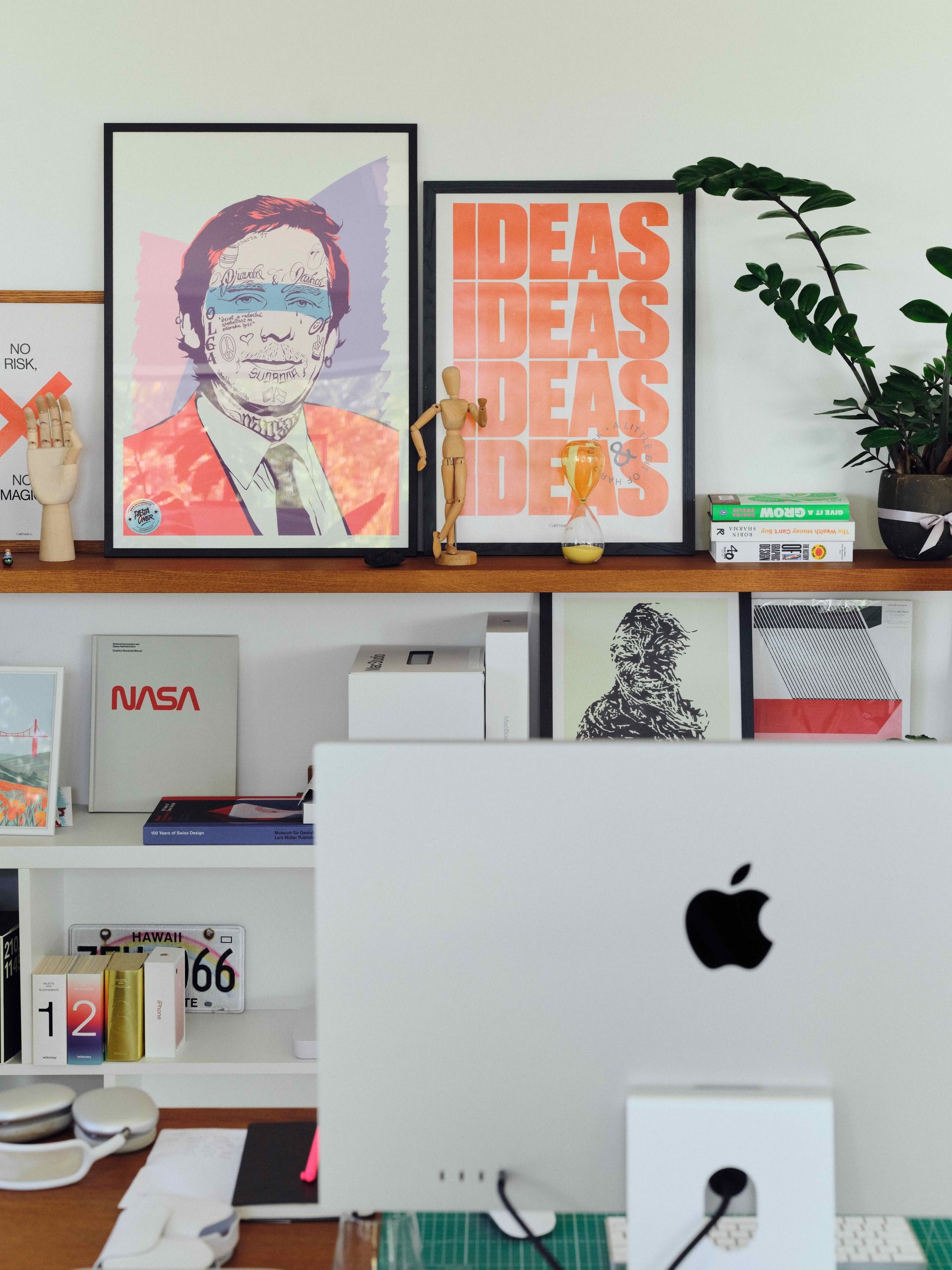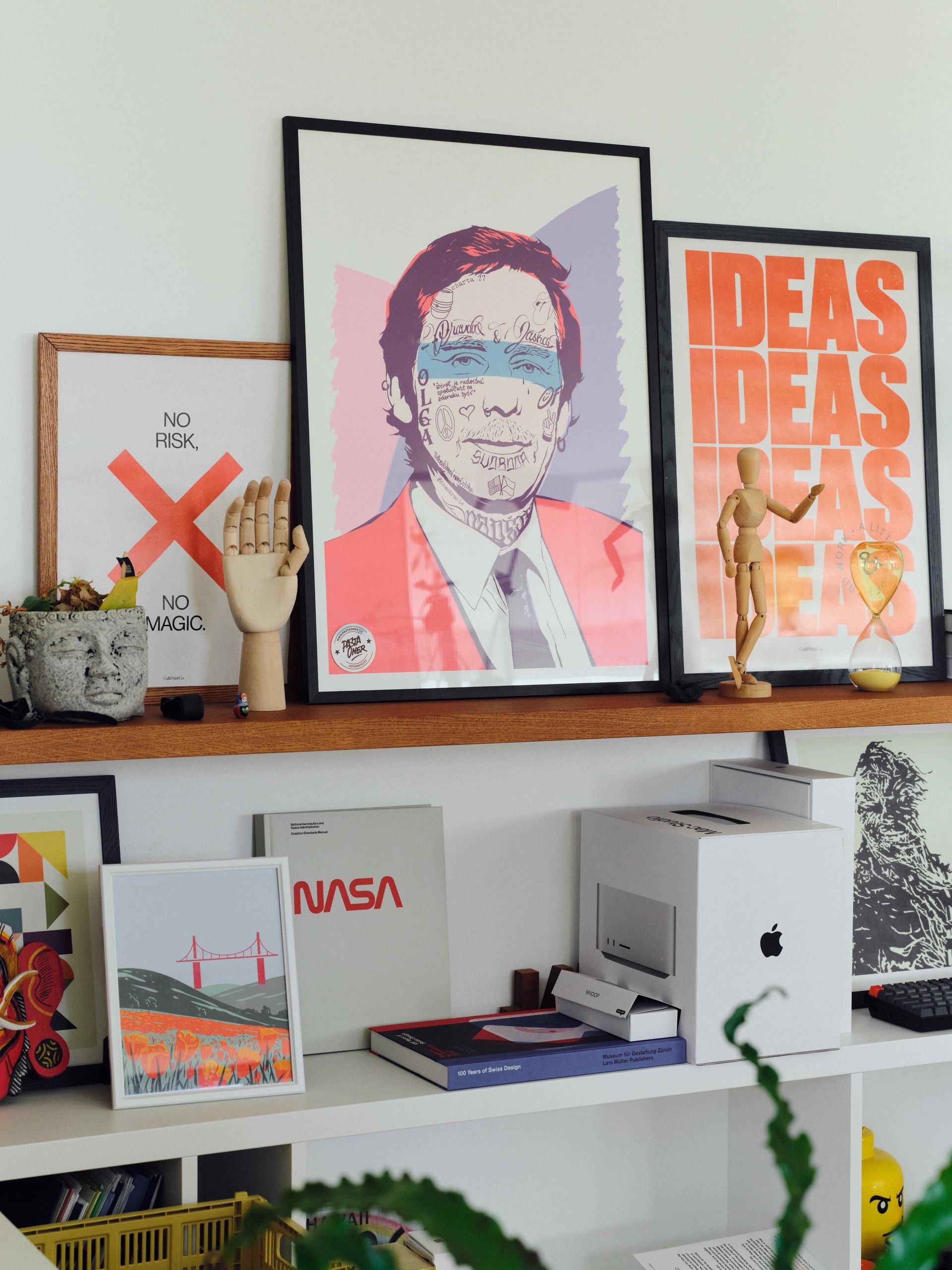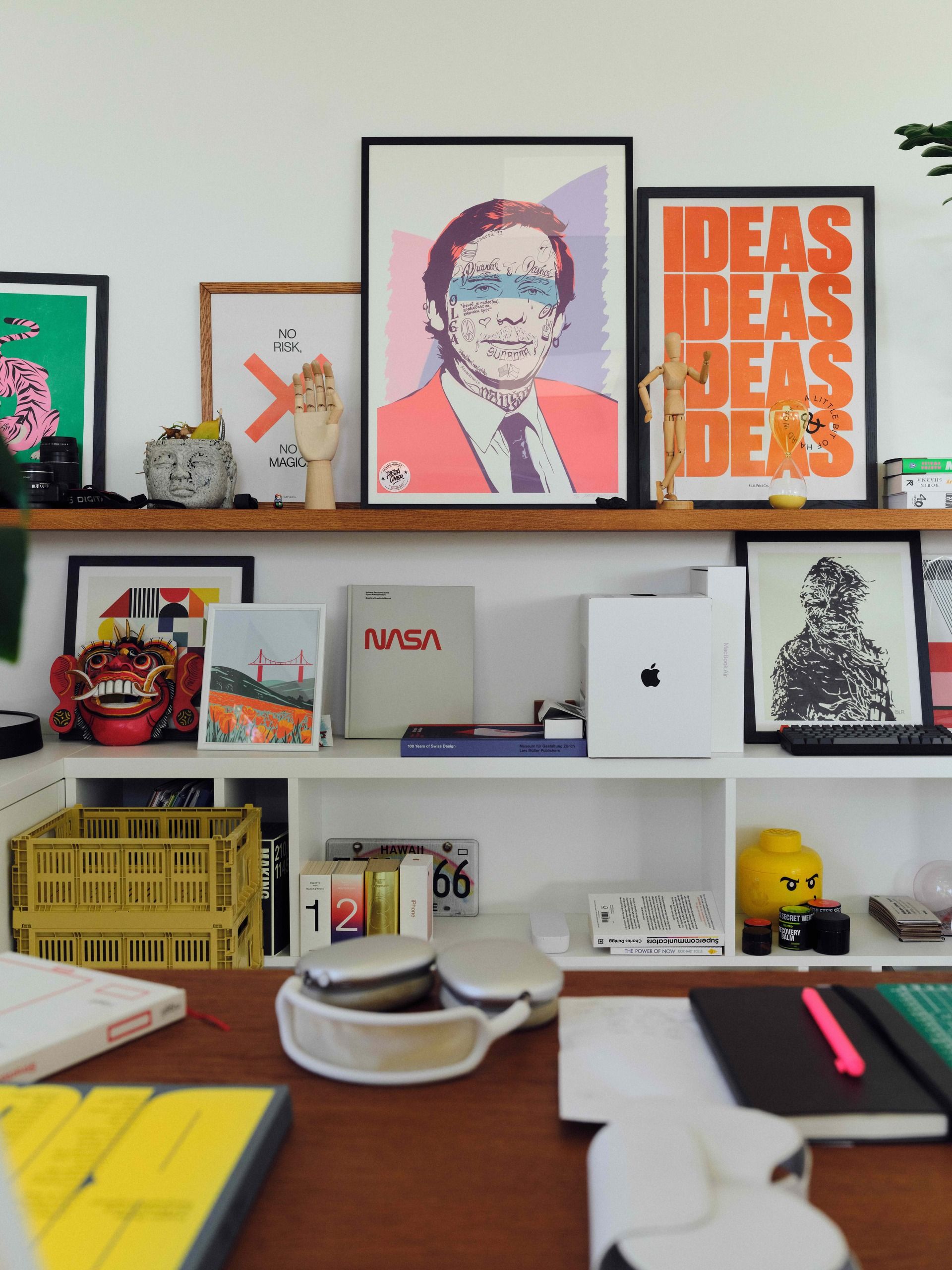 I don’t think this workspace will ever be “finished” — it’s constantly evolving. In contrast to my previous setup, which was minimal and almost sterile (all white everything), my current space is becoming more lively and personal. I’ve started incorporating items that reflect who I am and what inspires me, from travel mementos to family keepsakes. I wouldn’t change anything per se, but I definitely want to keep adding to it: a carpet, more posters, a mirror, more seating, plants. It’s becoming a living, breathing reflection of me and my creativity.