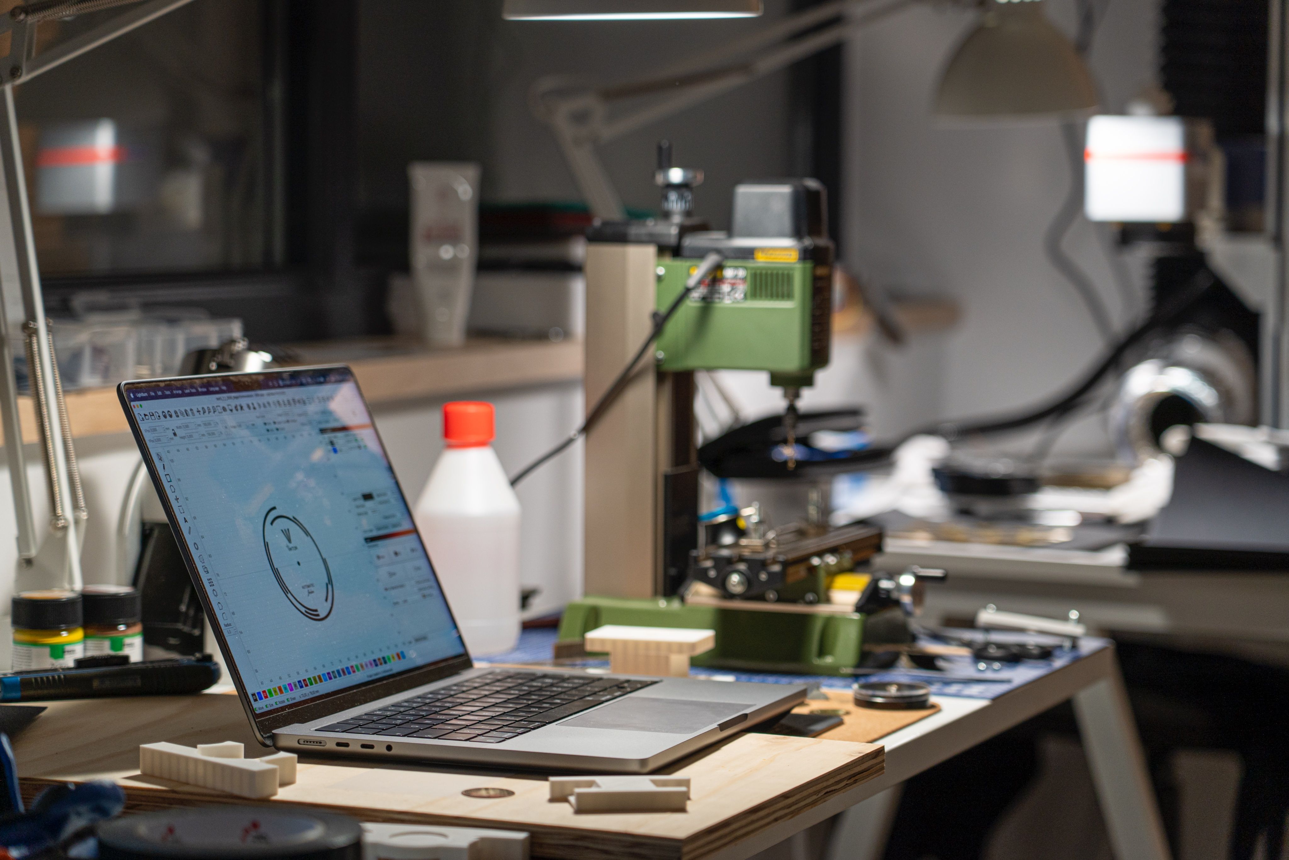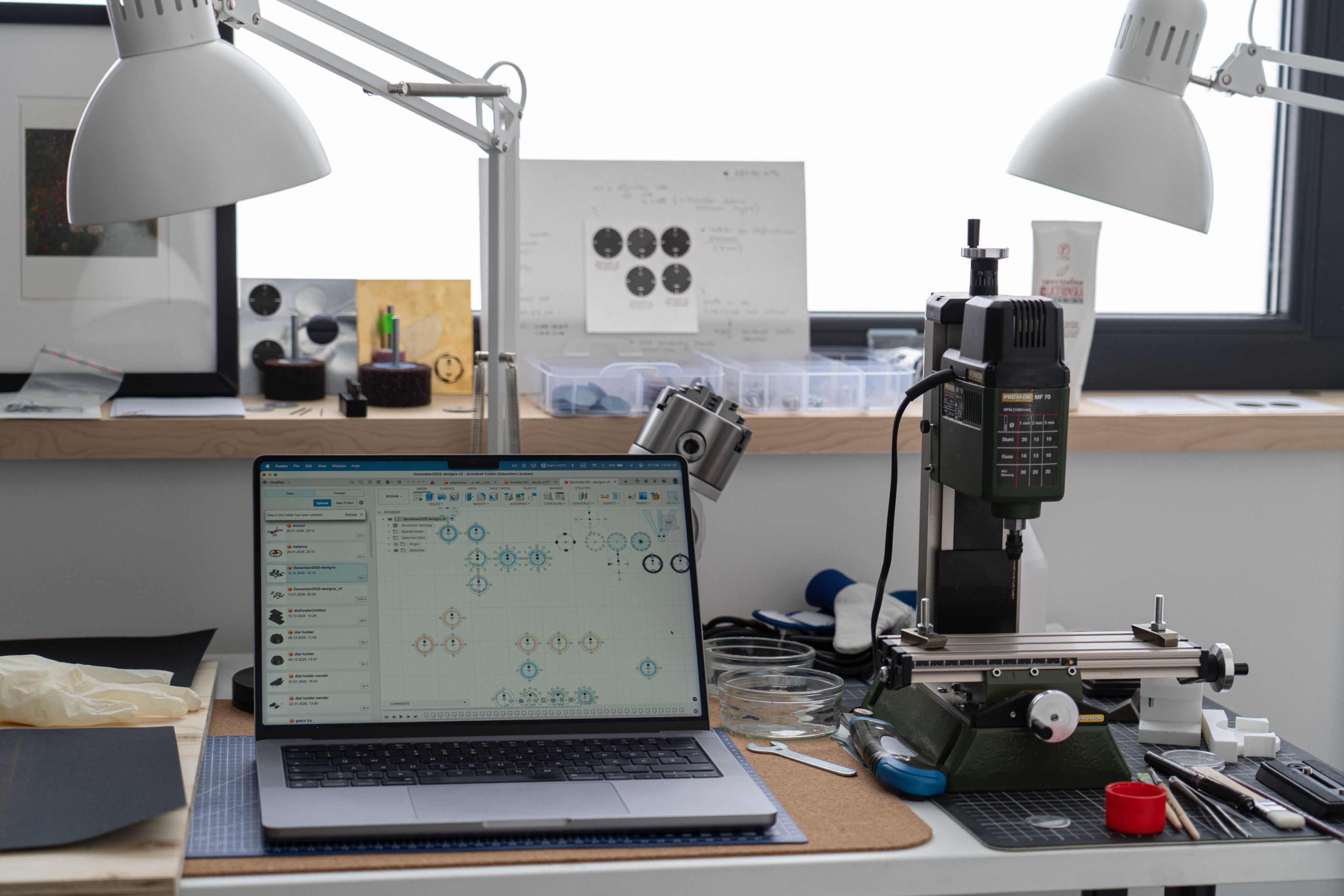 The other half of Viktor's world — a workshop bench where digital CAD designs become physical watch components.