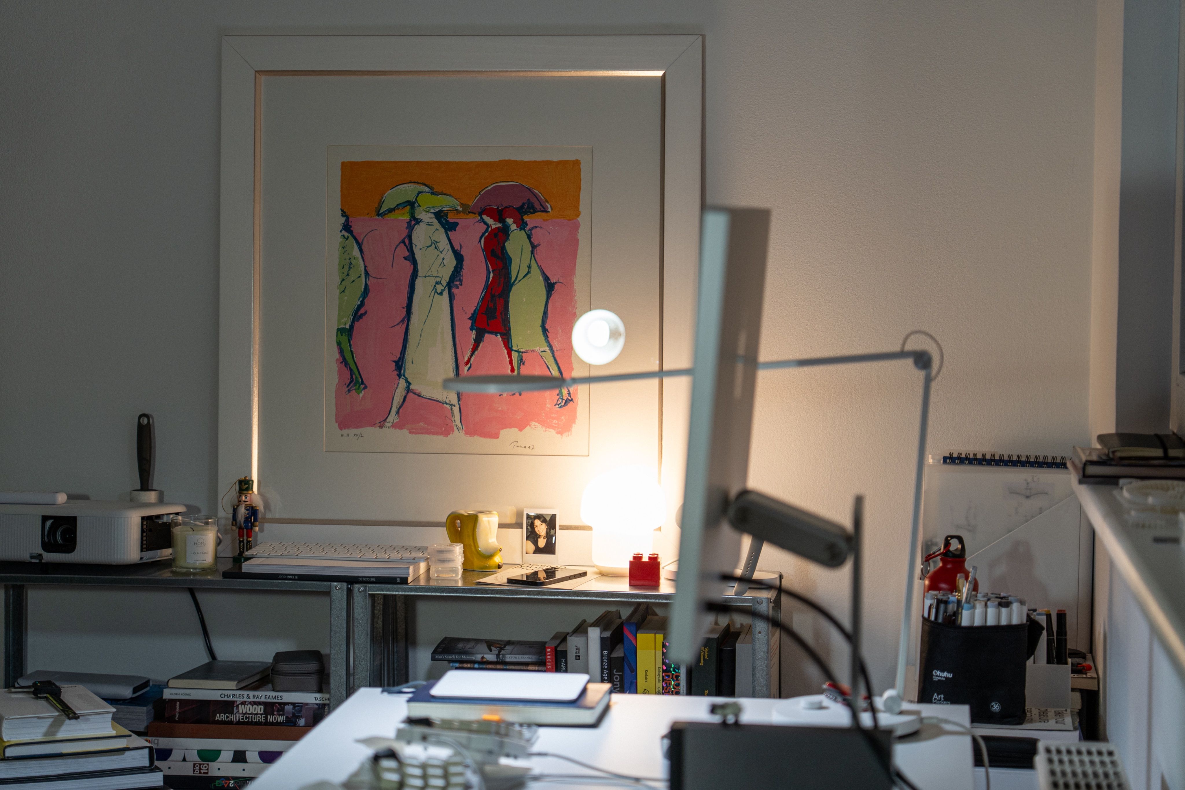After hours, the studio takes on a different character. Books, art, and a warm Artemide lamp help set the mood.