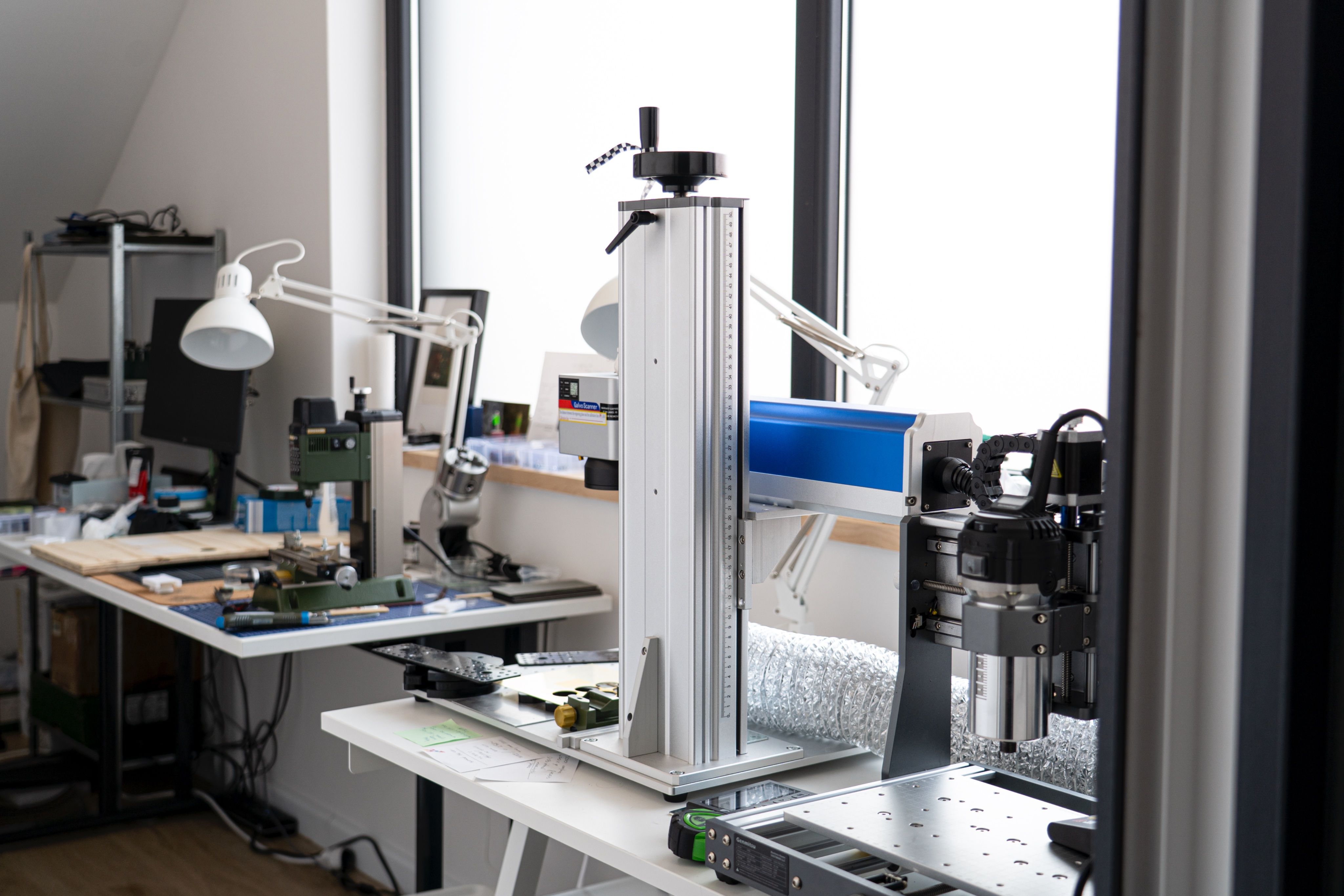 An independent watchmaker's arsenal — laser engraver, milling machine, Artemide lamps positioned for precision, and workbenches covered with the tools to bring it all together.